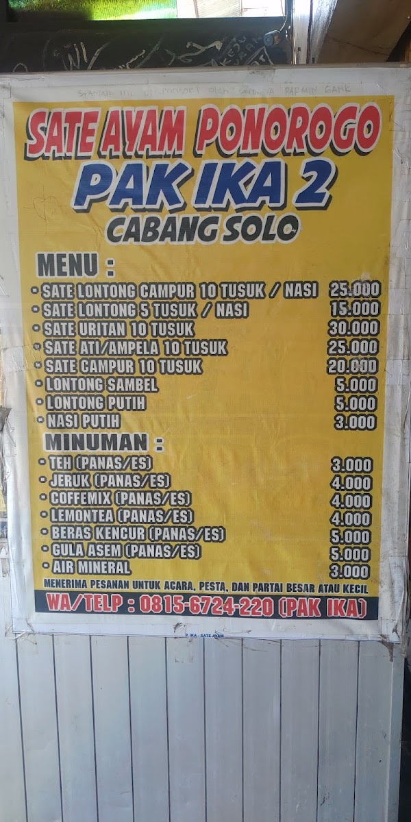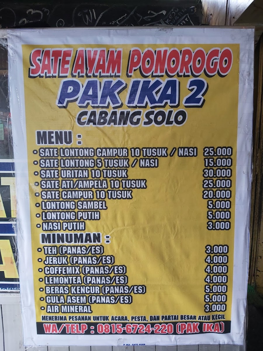 Sate Ayam Ponorogo Pak Ika 2 stands out as a beloved satay spot in Surakarta, cherished for its authentic and flavorful chicken satay experience. Located on Jl. Tentara Genie Pelajar Bibis Baru, this humble diner may not boast a luxurious setting, but its taste more than compensates. The highlight is their generously sized sate ayam, expertly grilled and served with a rich, spicy peanut sauce that dances on the palate. Customers can choose between traditional lontong or fluffy rice as a perfect accompaniment, ensuring a hearty meal that satisfies every craving.